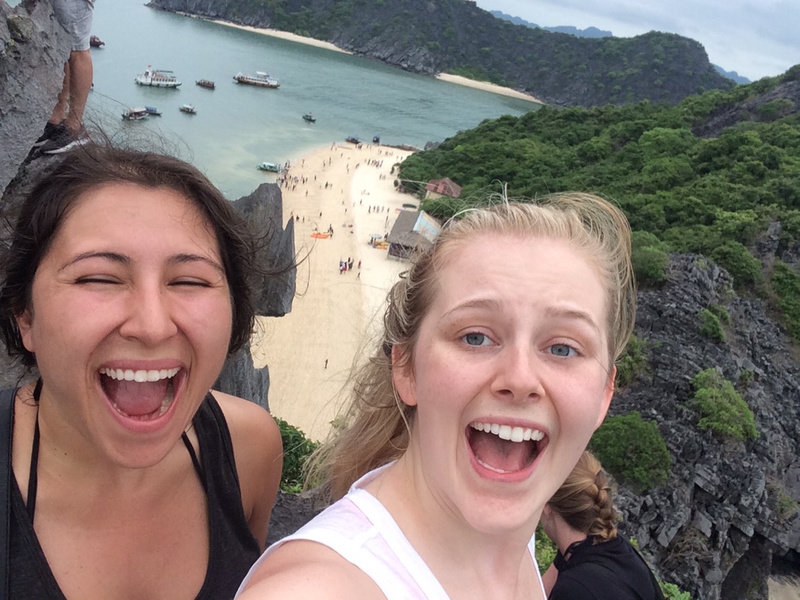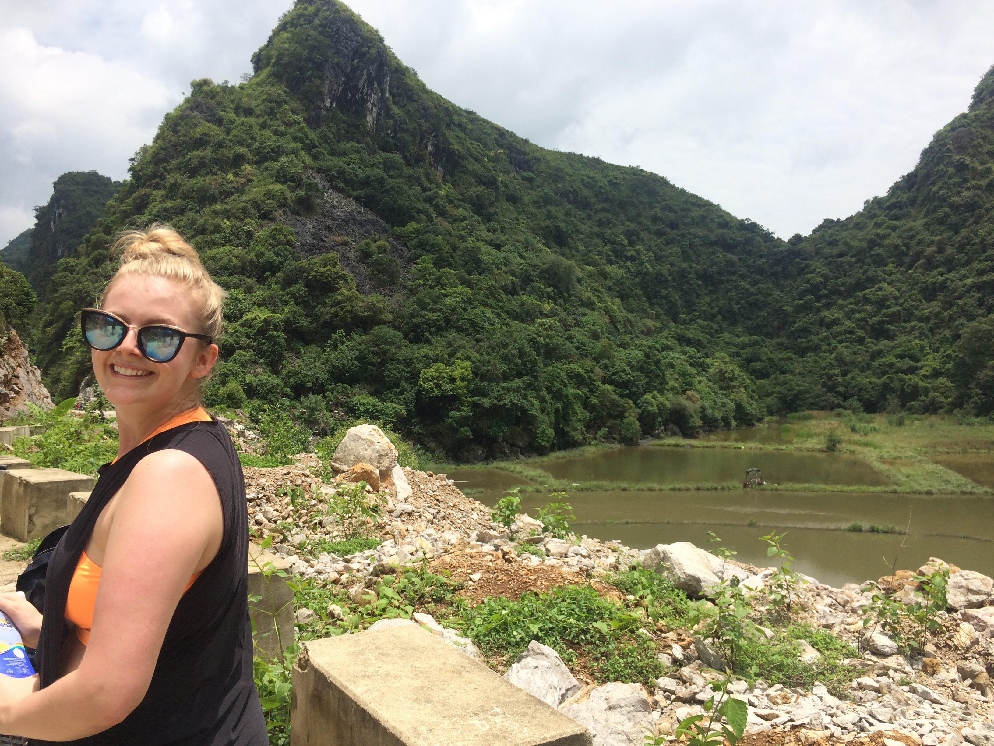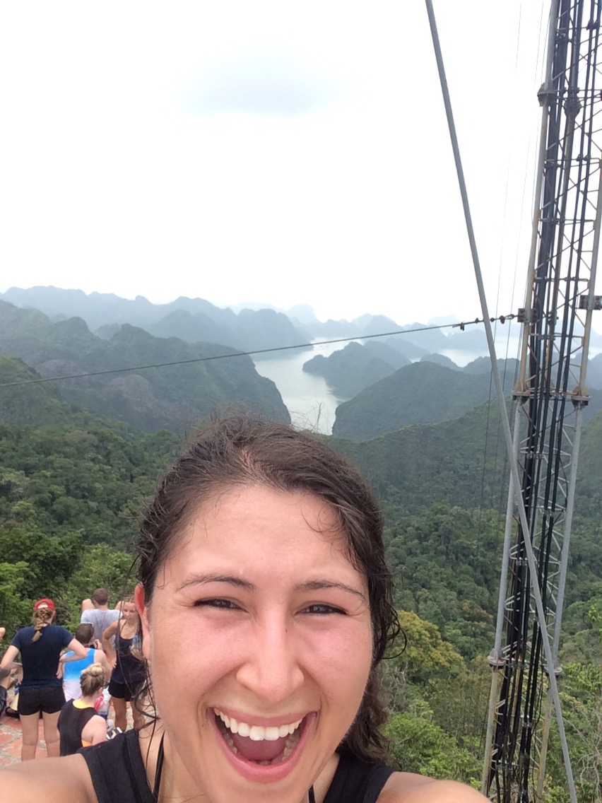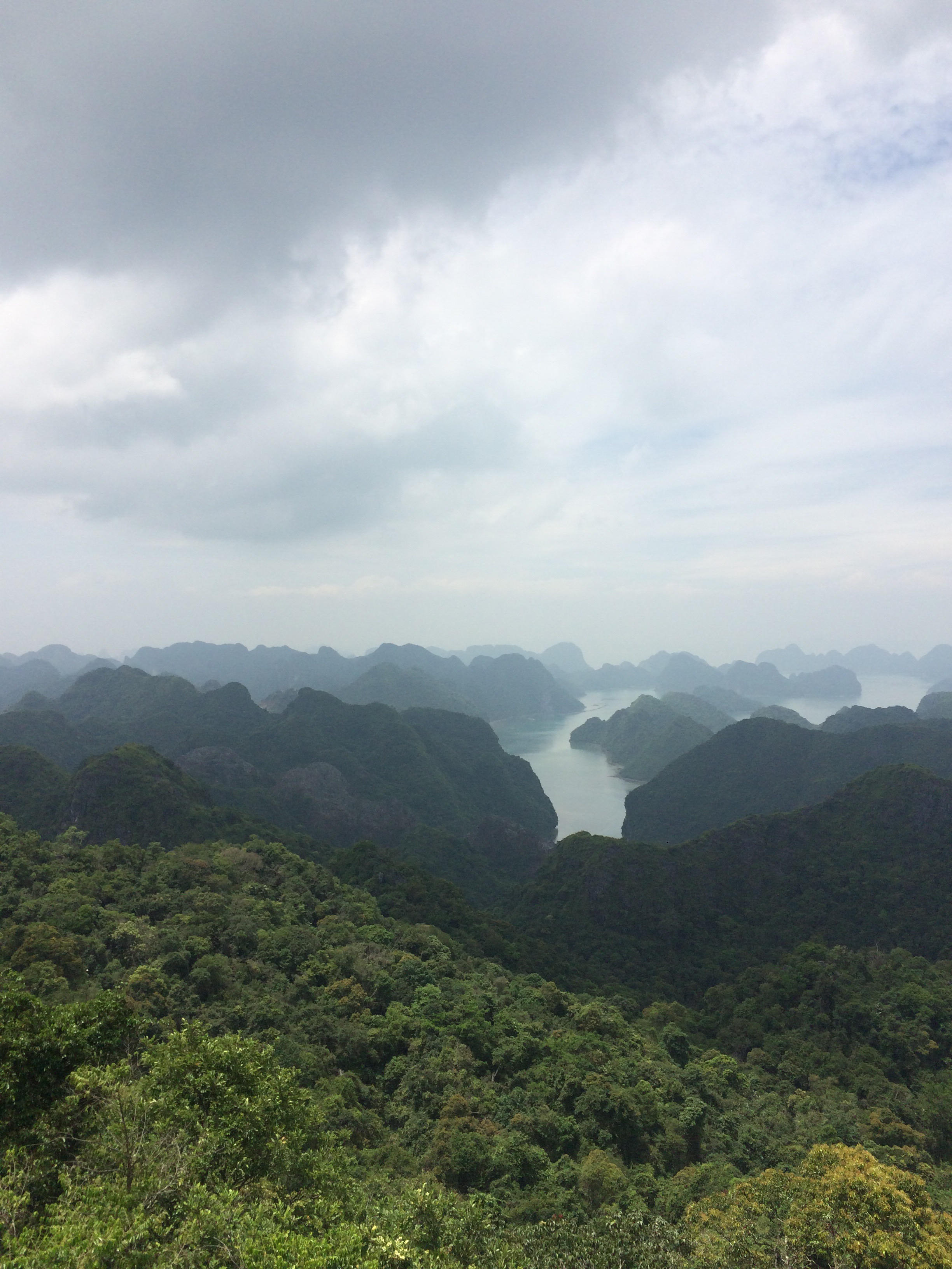 The next day, we had an early morning due to the cramped conditions inside of our room. It was fine though, as the food at the resort was fantastic. So many spring rolls and barbecued meat for dinner and so many pancakes and phó for breakfast. We set off for a very active day the next day and the whole reason why I booked this particular excursion: biking and hiking! First, we took a boat to another island then got on bikes for 5km or so to this trailhead. Then we hiked what I could only call death trap mountain. 45 mins up, not physically challenging in my opinion, but a slog through basically scrambling on rocks the whole way and avoiding extremely slippery mud. The view was worth it though! The way down is a story for another day….