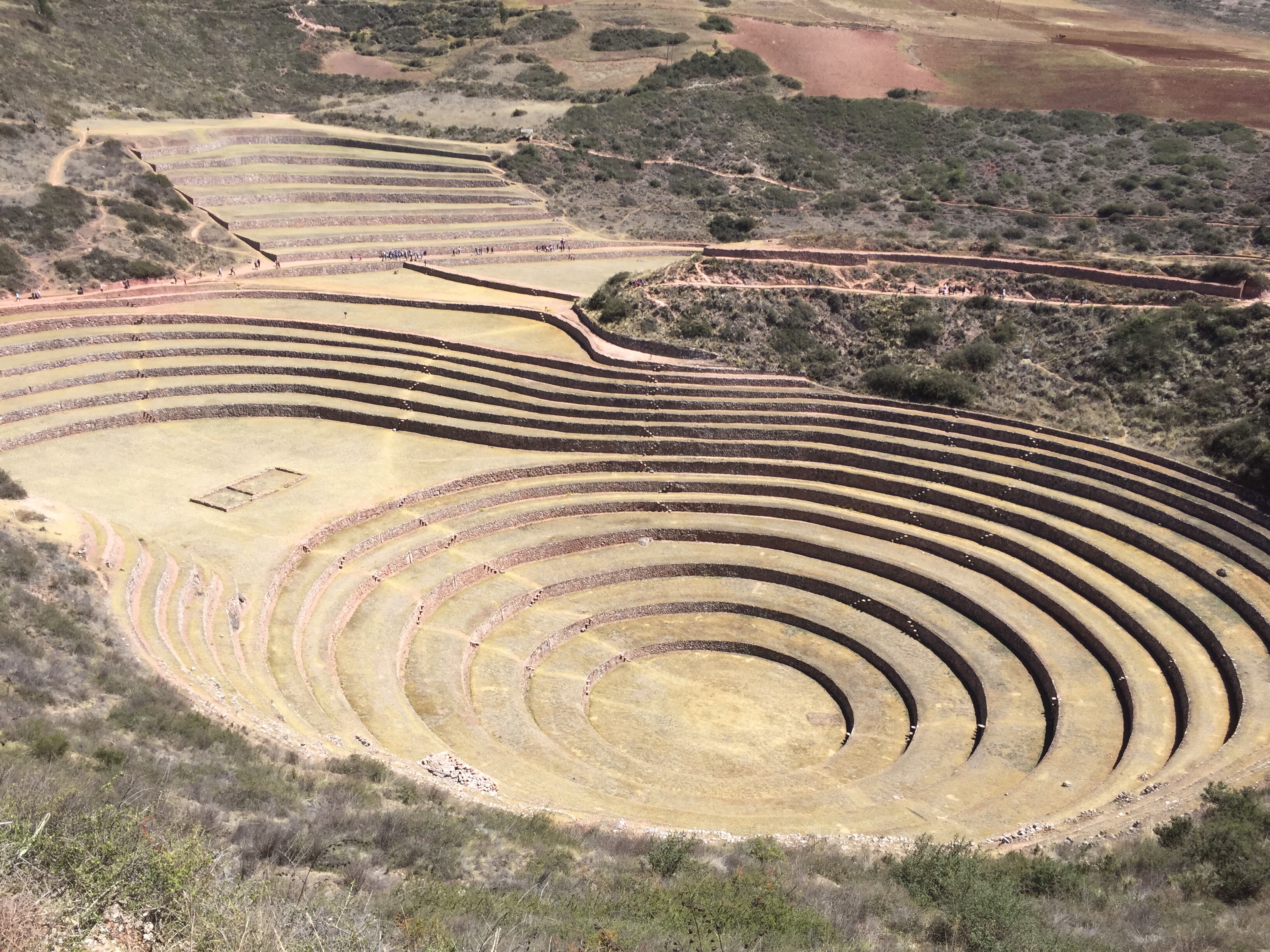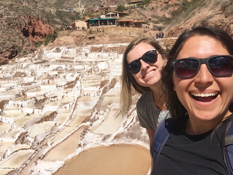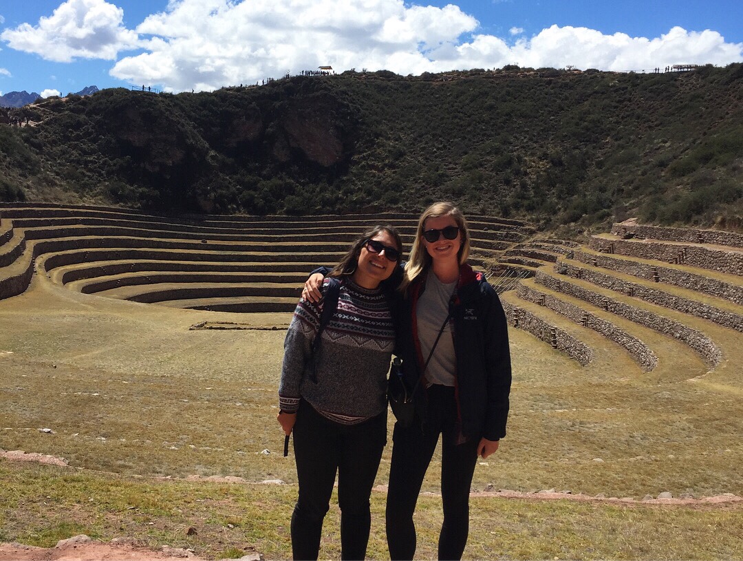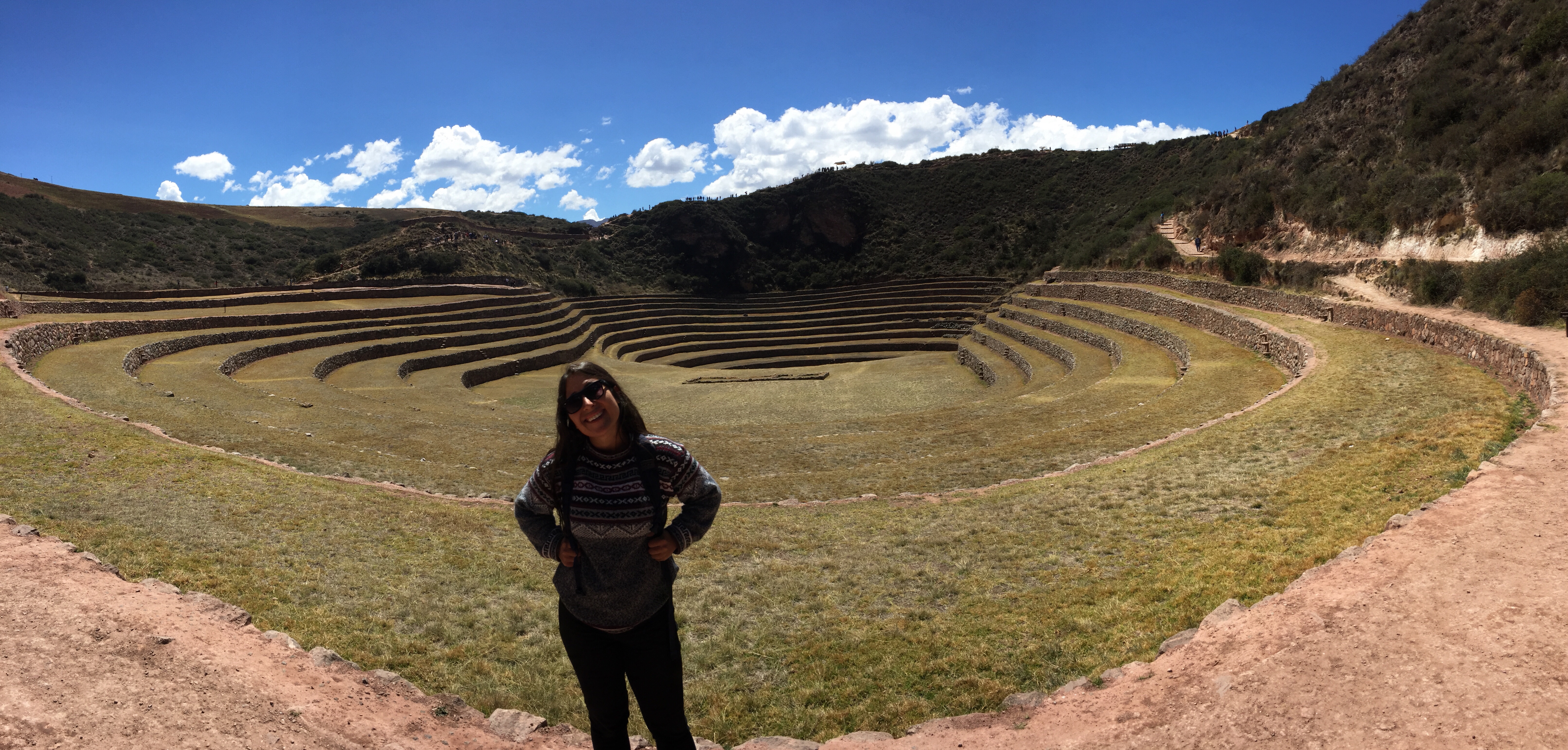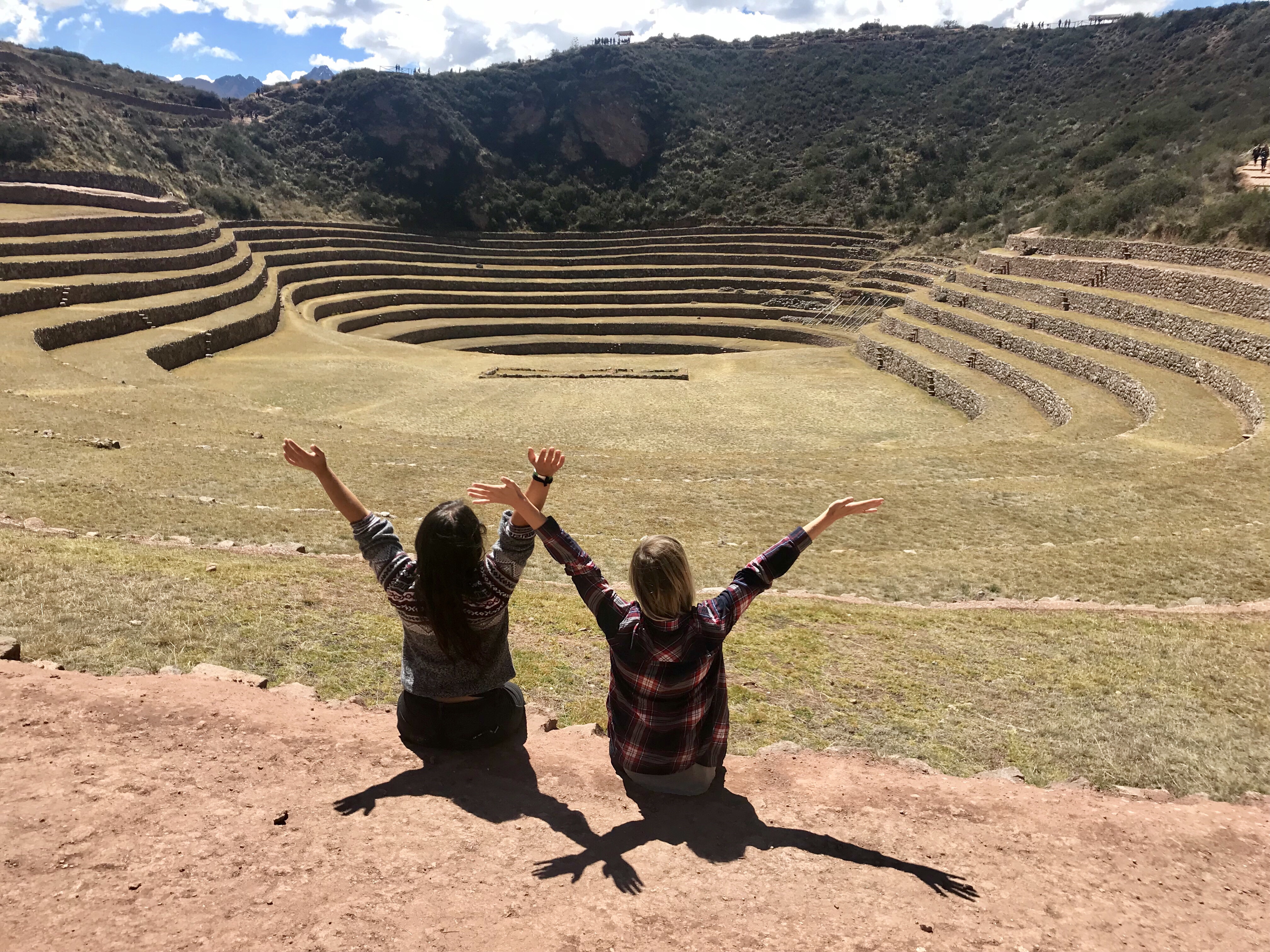 First the driver took us to the Moray ruins which were a bit outside of town, probably a 20 minute drive. The roads were so sketchy but we made it! We paid the entrance fee of 70 soles which also gets you into some other sites near the city of Urubamba but we just wanted to see Moray! It was beautiful! We asked an older Italian man to take a photo of us and it was important to him that we take one “feeling the energy” of the ruins – can you guess which photo it was of the following?