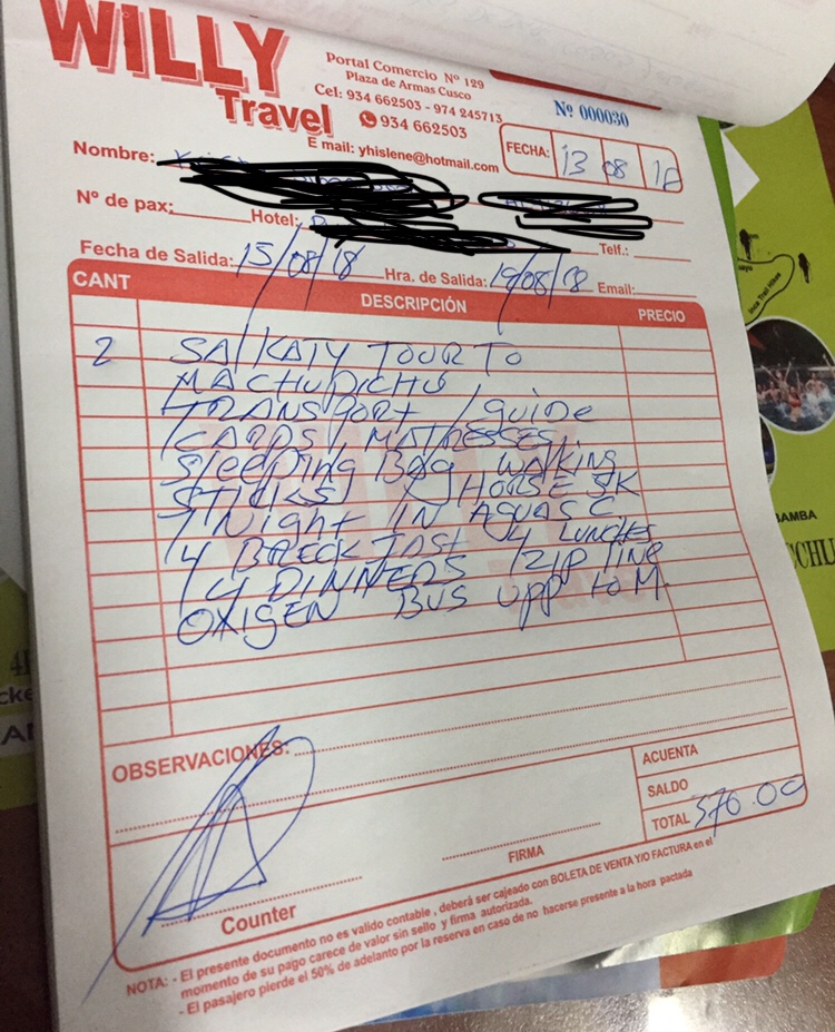 We then looked around for Willy for our tour. Our instructions were that his name is Willy and his office shares a hallway with a Tattoo parlour near the Plaza De Armas. What we didn’t realize was they his office didn’t have signage for his agency, just this other agency called Glacier Travel. It felt like we were on the Amazing Race trying to find him – we ended up finally finding him after asking another operator in the area where he was. We booked our Salkantay Trek with him for the Wednesday August 15 for $185 USD which was a good price considering we were supposed to be getting our trek plus going on a zipline. We were told to make sure everything we got was on our receipt so here it is for your viewing – it will come in handy for my next post but did NOT come in handy for us on our trek – but that is a story within itself!