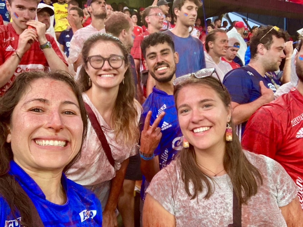 On Thursday afternoon, I joined the hostel trip to the football game. Medellin has two teams, and on Thursday we went to the blue and red team’s game. A bus picked us up and took us close to the stadium for what I can only describe as a traveller’s tailgate. I bought a jersey for $6 CAD and we hung out with friends from our hostel as well as with people from other hostels. At game time, our guide led us to our seats, which was in the general admission section of the stadium. The game started with a lot of noise and then some colour smoke bombs in red and blue, the home team’s colours. The game became quite chaotic when it immediately began to pour down rain, and resulted in the red dust setting and staining our clothing and skin. In the end it just made everything more chaotic and fun.