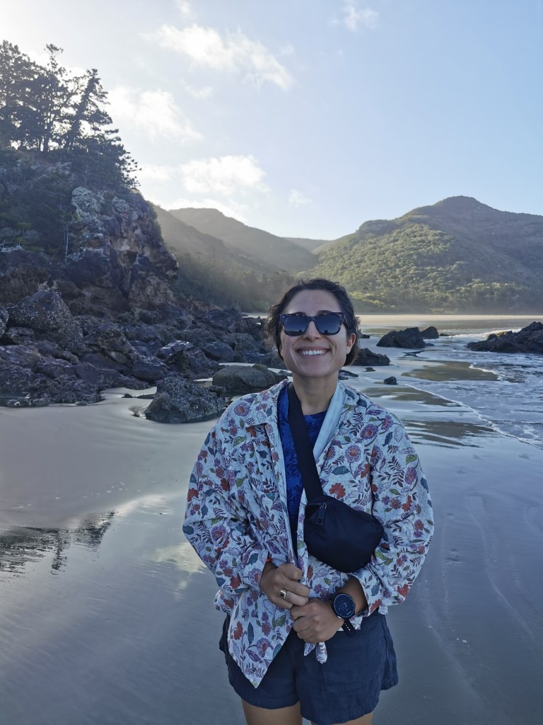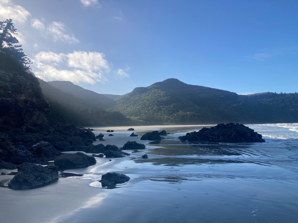 The setup of the campground was quite interesting as it was the only developed land in the surrounding area. It offered a stunning beachfront location. We were lucky to secure a private tent spot, set apart from the more exposed trailer and caravan sites. Our evening was spent strolling along the beach, taking in the beauty of the trees, the ocean, the tides, and the remarkable volcanic rock formations lining the shoreline.