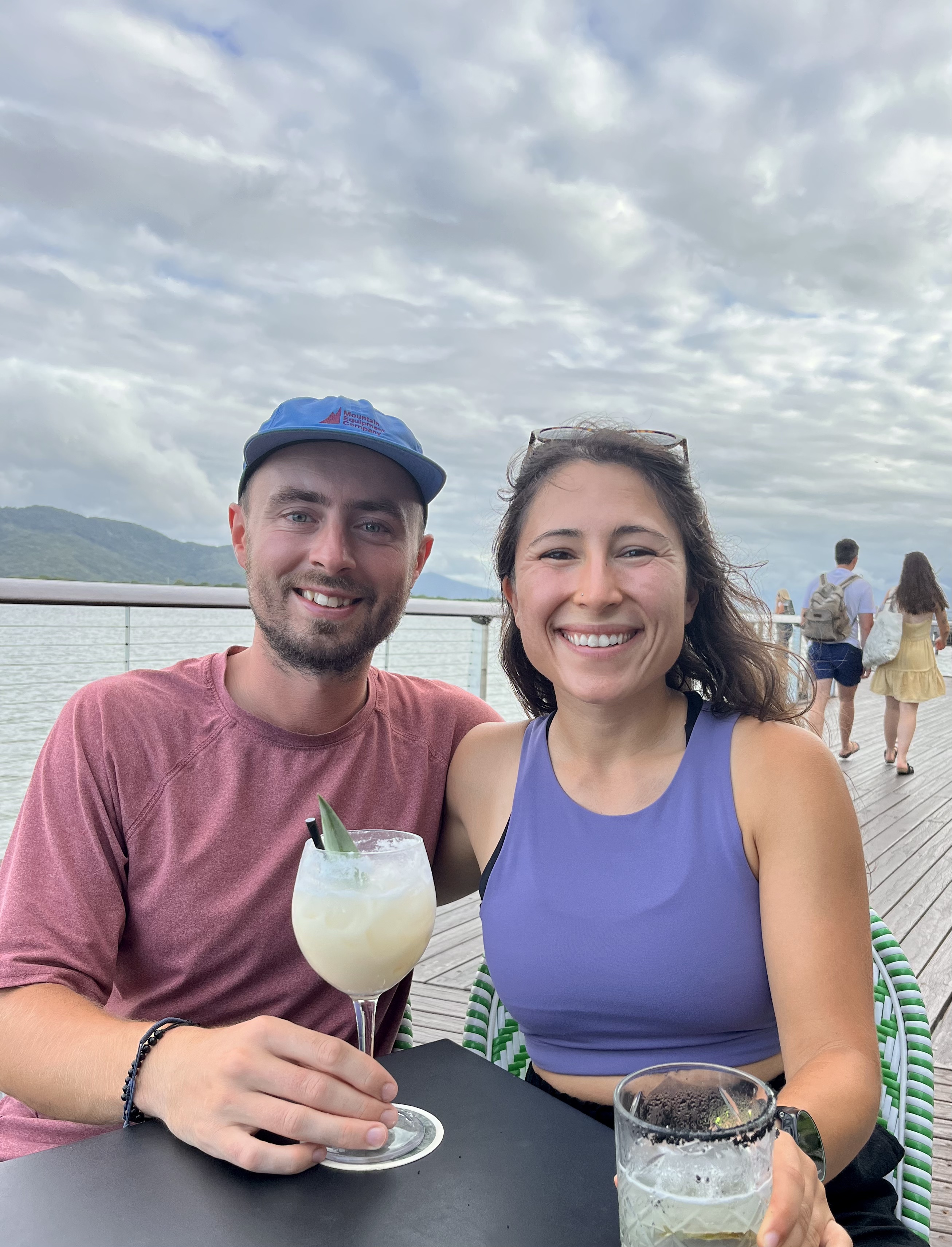 It was already the afternoon by the time we arrived in Cairns and met up with George’s mom, so we decided to drive into town and check out the lagoon. Many of the major tourist areas in North Queensland have swimming pools right on the water due to the dangerous animals that exist in the ocean for the majority of the year, specifically crocodiles and deadly box jellyfish. These free public swimming pools are a great compromise to not being able to go in the ocean, while still having a beachy feel. We also appreciated the opportunity to keep cool in the extremely humid weather. We spent our afternoon near the lagoon before walking around the pier and finding a nice patio to enjoy happy hour.