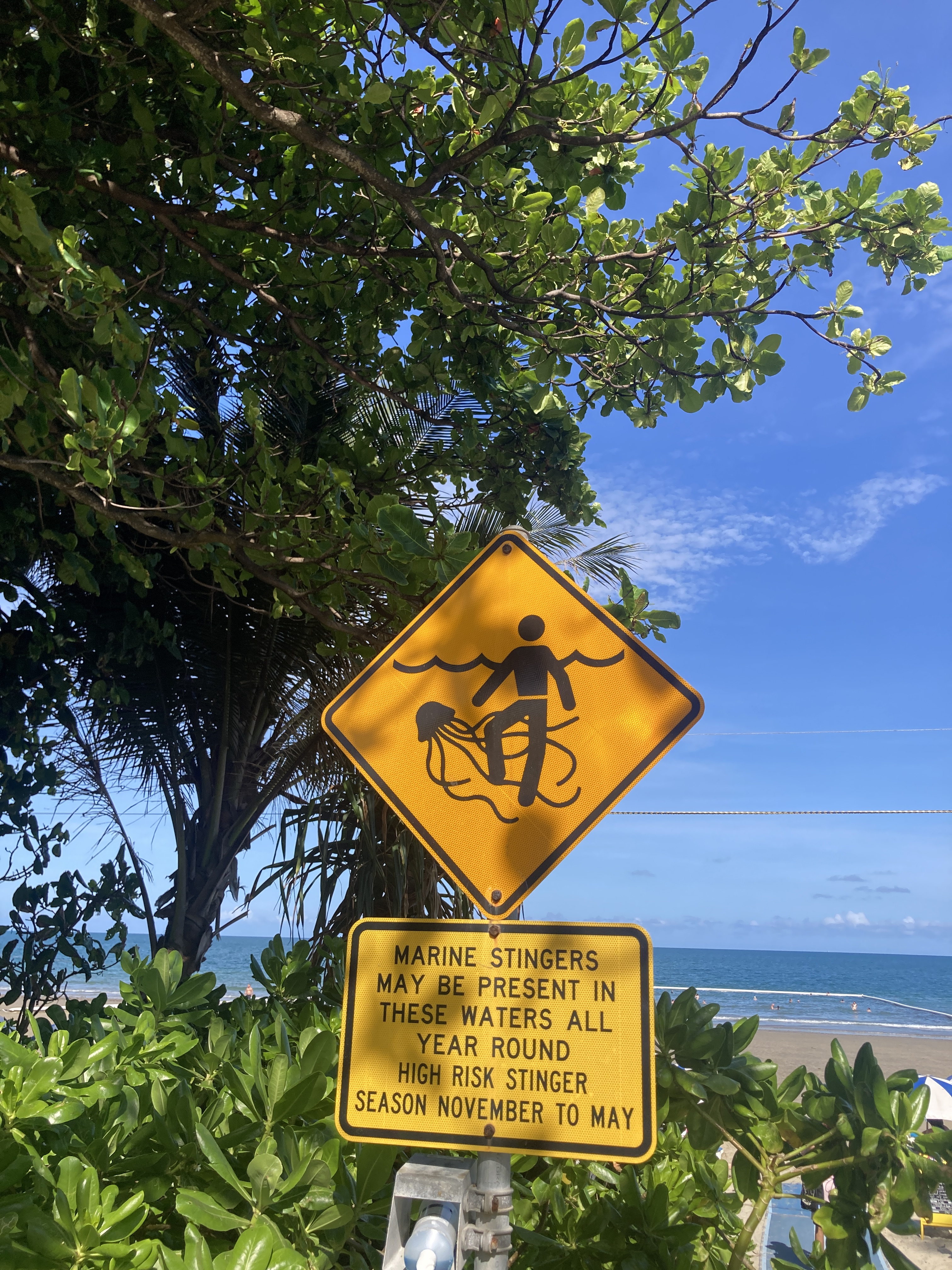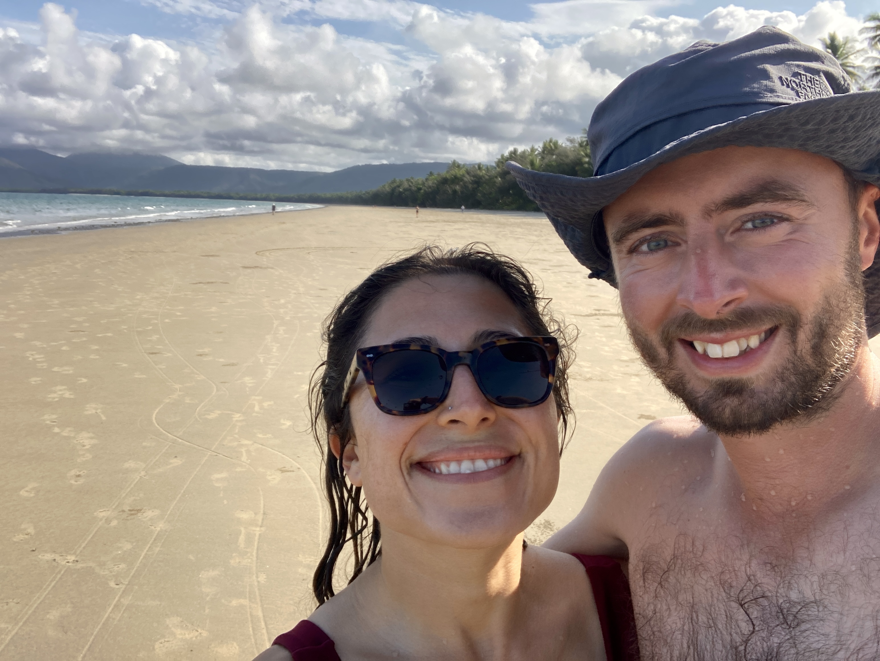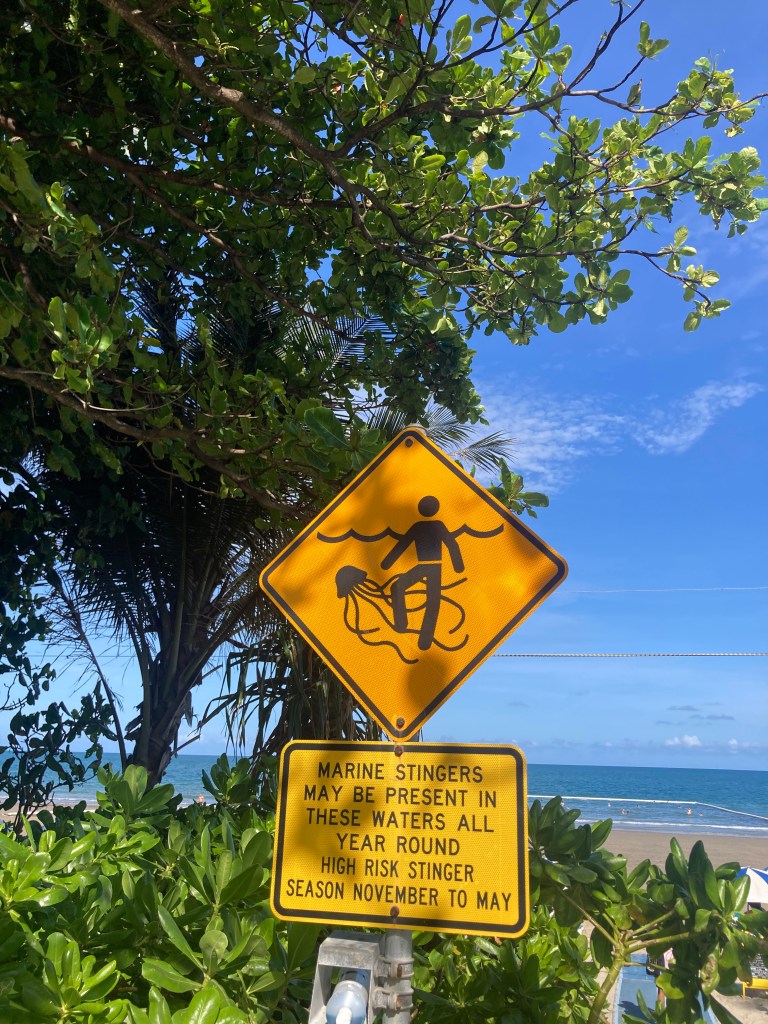 After exploring Mossman Gorge, we continued driving up the road to Port Douglas. The landscape and scenery around Port Douglas were so beautiful, with palm trees, golden sand beaches, and hilly forests in the distance wherever you looked. We walked around town and the waterfront before heading down to a beach that had a jellyfish net to keep swimmers safe while enjoying the ocean. We were shocked and delighted to discover how warm the ocean water was once we started swimming. It must have been 27 or 28 degrees, and felt just like a warm bath. While the jellyfish nets weren’t visually appealing on other otherwise picturesque shoreline, we could understand how and why they were implemented as the beautiful warm temperature of the water was a joy to experience. Since being in Australia I have also learned that these bathtub-temperature waters are an indicator for locals on when the ocean water is safe to swim in through the year. My friend from work on the Gold Coast, who was from North Queensland, told me that as soon as the water felt like the bath, it was jellyfish season.