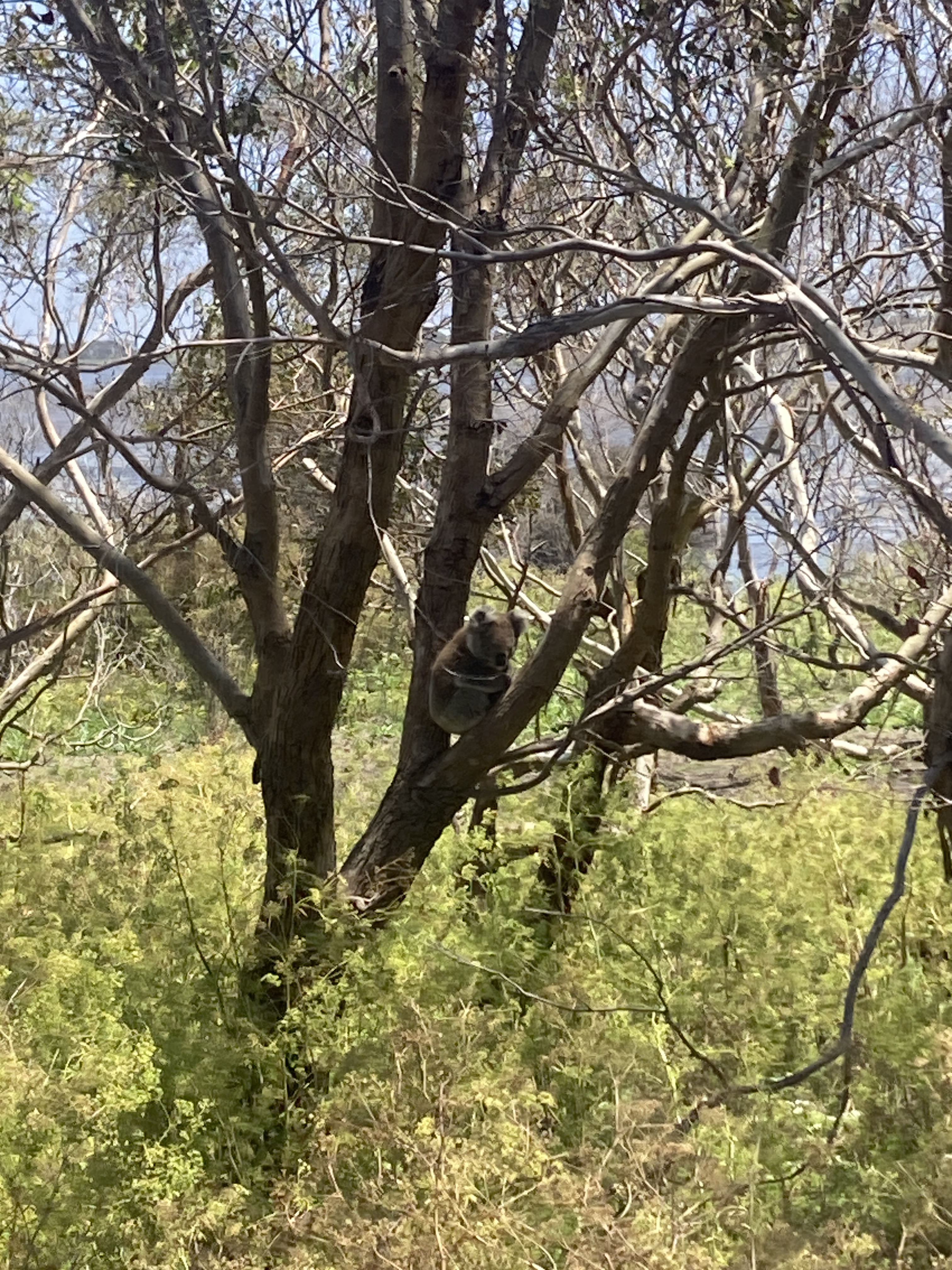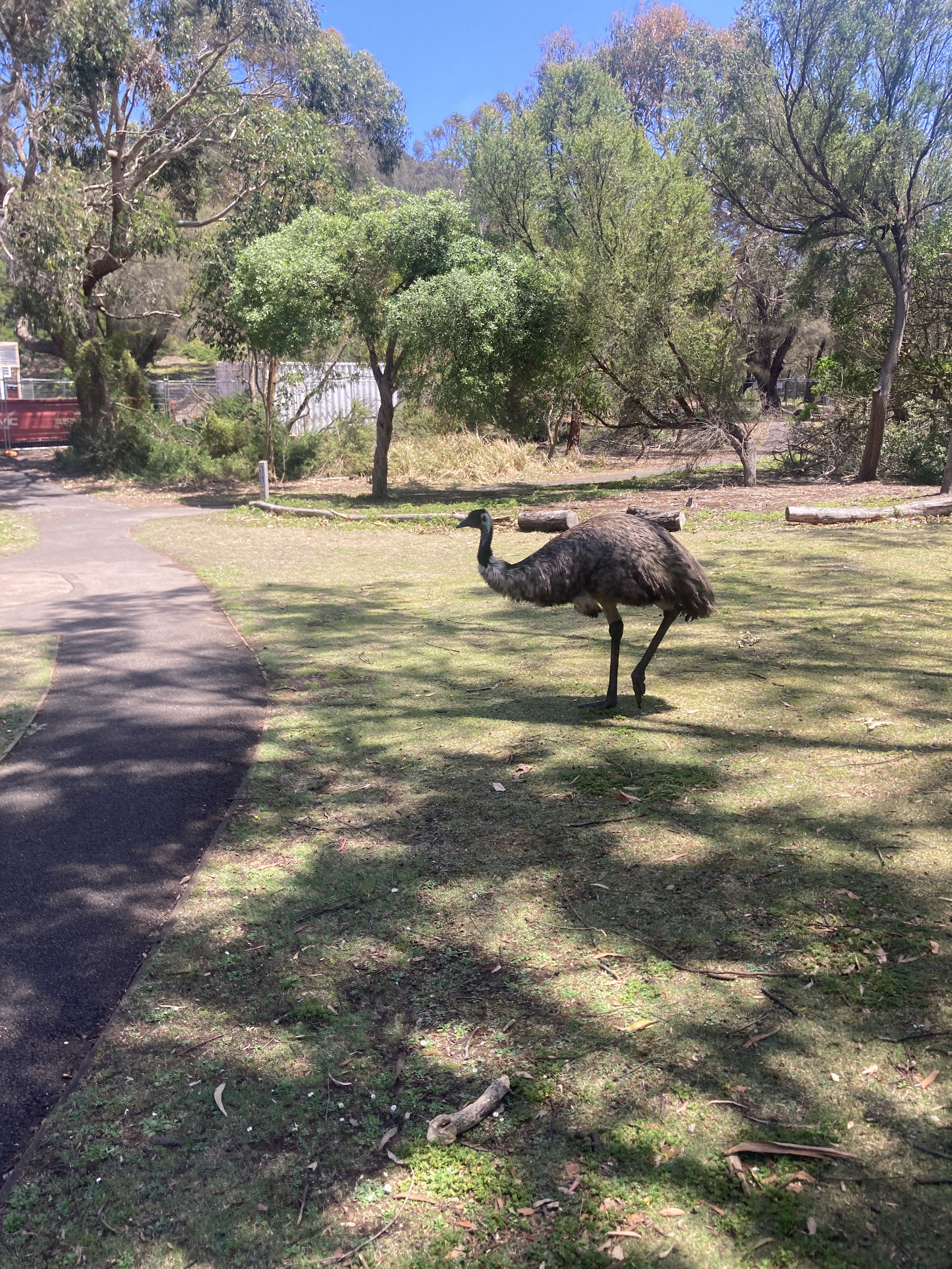 Another highlight of the day was stopping at the Tower Hill Reserve, a protected natural area that was quite close to Port Fairy. We had read many reviews stating that people had seen wild koalas and emus in this reserve, and that was all the information we needed to make a stop. After seeing a koala sitting in a tree on our drive in, we went on a short hike to a lookout, then drove around to the main visitor area. We were delighted and thrilled to see two wild emus walking around, as well as four koalas in the trees. While these animals were wild, it was quite obvious that the emus had been fed by people who were sharing their lunches, as the emus were not afraid of humans at all. This is one of the sad and frustrating parts of some wildlife viewing here for me, as it seems to happen more often than not.