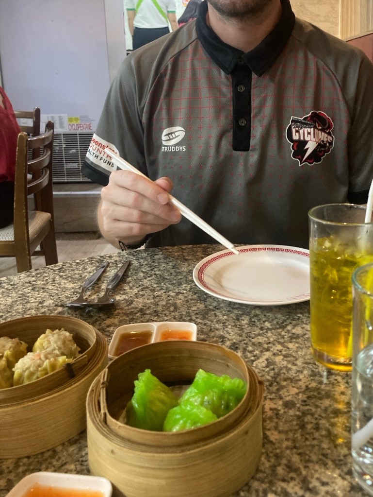 Our next stop was a Chinese restaurant where we were excited to sample the dim sum. At this restaurant, we tried the pork siu mai, emerald shrimp dumplings, and roast duck on rice. We also tried a chrysanthemum tea drink that was a bright yellow colour – we saw that everyone else around us had ordered it and wanted to see what the hype was about. It was very sweet but tasty and reminded us both of buttered popcorn.