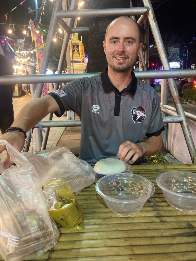 After about an hour, we managed to escape the shop and headed a few blocks up the road to an outdoor night market we had seen from the bus. This night market was outside a different shopping centre and definitely catered to locals, with interesting foods and very low prices. After exploring the market, we opted for green curry and some noodles. The green curry was particularly fun as it was served in a bag with rice noodles wrapped separately. We were given bowls and put it all together ourselves. I should also add that it was delicious.