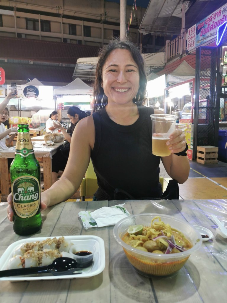 Chiang Mai is known for its night markets, and we were excited to try our first one. As we arrived close to closing time, we managed to get a table at one of the sought-after food stalls, Suki Changphuak, for some delicious stir-fry. We were lucky to be eating later, as people sometimes wait for hours to eat food from this incredible stall!