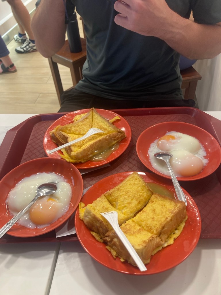 We started our day with a local special for breakfast called Kaya toast. This is a popular breakfast in Singapore consisting of toast with a coconut-flavoured custard that you dip in lightly poached eggs. It was interesting and fun to try this local breakfast.